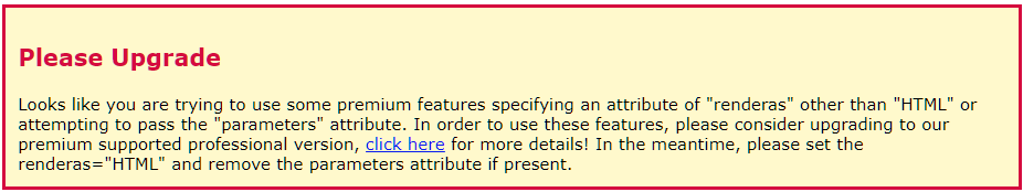 The upgrade message will be displayed in the free version of the plugin if options only available in the professional version are detected.  For example, the renderas attribute of "HTML" is the only supported attribute value, if any other value is detected, this error will be displayed.