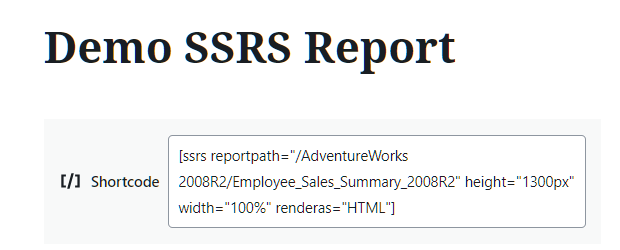 Once the report server information has been entered within the settings, reports can be displayed by using the "ssrs" shortcode and setting some attributes as outlined in this section.