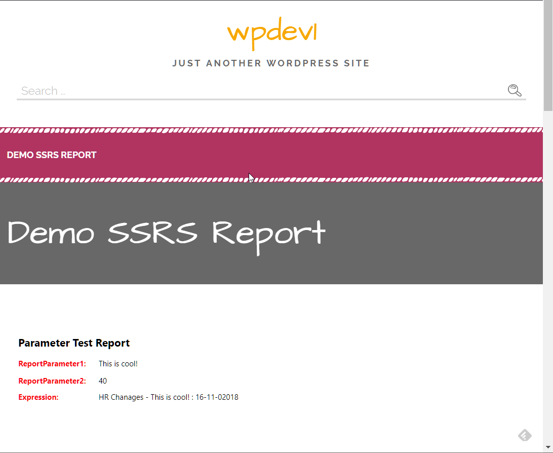 2. From a blog entry or page, add the ssrs shortcode (e.g. [ssrs reportpath="/TestReports/ParmTest" height="1200px" width="100%"])